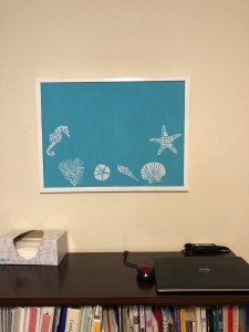 I bought some acrylic craft paint at Walmart and some seashell theme stencils online. I decided to keep it simple by using only two colors. One for the board and another for the frame and stencils.